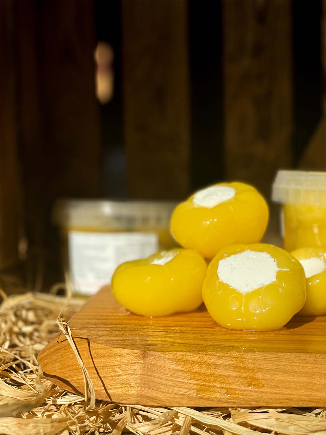 Papryka jabłkowa to zwyczajowo żółta pikantna papryczka w kształcie owalnym, idealnie nadająca się do faszerowania przeróżnymi pastami, czy serami. Nasza konserwowa papryka niesie ze sobą delikatną słodycz. Nadziewana jest jasnym serkiem idealnie korespondującym się z lekko kwaskową papryczką.