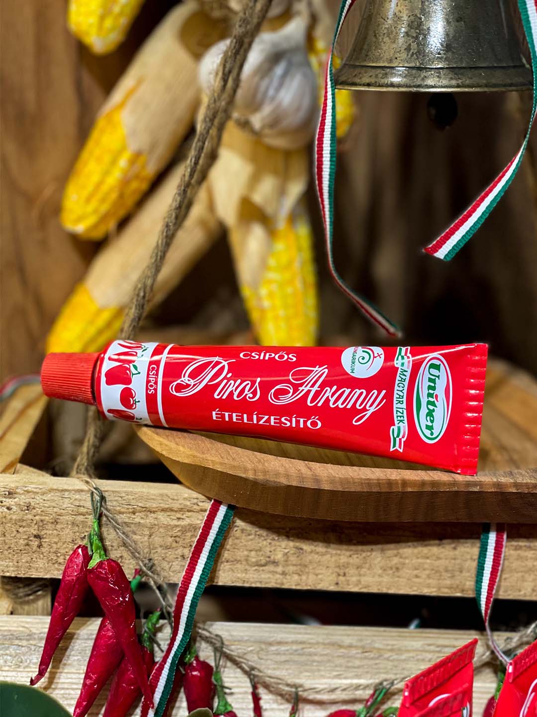 Piros arany to w dosłownym tłumaczeniu czerwone złoto. Takim sformułowaniem zwykło się określać skarb madziarskich ziem, jakim jest aromatyczna papryka słodka. Część tego „złota” zamknięto w poręcznej tubce o charakterystycznym wzornictwie. Jakość pikantnej pasty paprykowej z Węgier jest niezmienna od lat. To zasługa unikatowej metody przecierania papryki i niepowtarzalnej kompozycji najlepszych składników. Pasta posiada wyrazisty, ostry posmak, który dodaje pikanterii i podbija smaki wielu różnych posiłków.